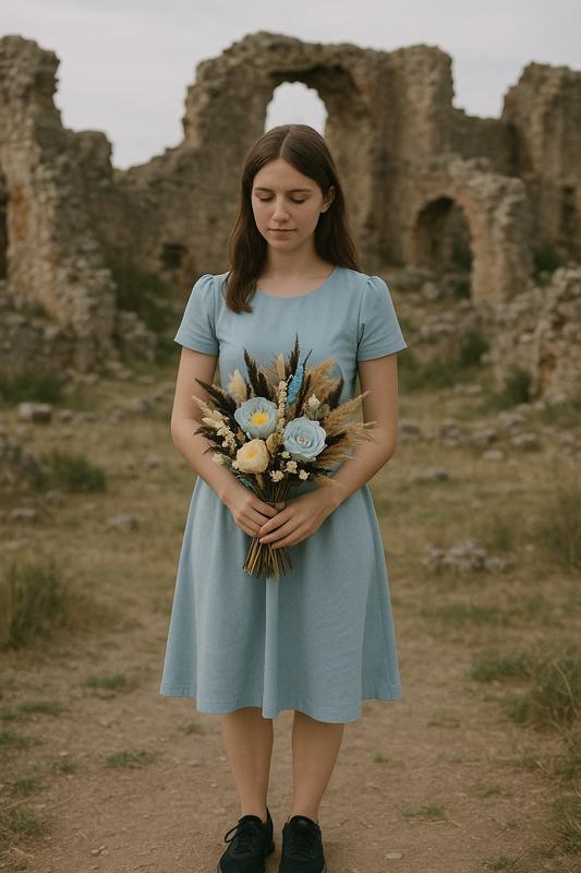 Неймовірно стильний букет ручної роботи, створений з поєднання сухоцвітів, пампасної трави та штучних квітів у блакитному, чорному та бежевому кольорі. Такий букет стане ідеальним вибором для сучасної нареченої, фотосесії або як декор для оселі. Основу композиції складають штучні квіти півонії, маку та троянди, доповнені стабілізованими рослинами, колосками, лагурусом, сухими травами та декоративними гілочками. Букет надійно перев’язаний мішковиною та стрічками — готовий до використання одразу після покупки. Переваги: • Унікальний дизайн — тільки ручна робота • Натуральні та довговічні матеріали • Не потребує догляду • Залишиться красивим на роки Подаруйте собі витонченість і стиль — замовляйте зараз!
