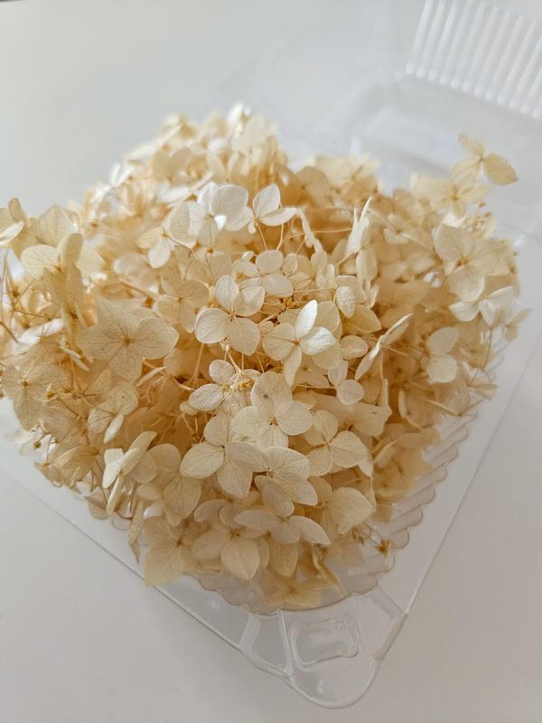 Гортензия в боксах для декора (скрапбукинг, свечи, эпоксидная смола, декорирование десертов и т.д.). Сами соцветия. Цвет: кремовая. Размер цветков: мелкие Размер коробки: 10 × 10 × 6 см Вес упаковки: 15 грамм