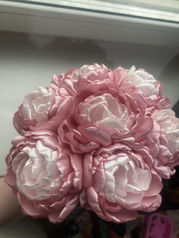 Ручная работа. В букете 7 цветов из атласной ленты. Цвета могут быть разные все по вашему желанию. Количество тоже. Сроки выполнения зависят от количества цветов и упаковки. В основном до 7 дней. Цена одного цветочка 50 грн. Цена упаковки оговаривается отдельно. При заказе 50% предоплаты