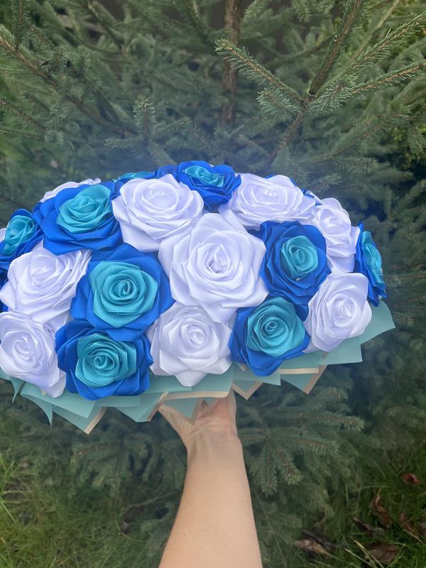Це ефектний декоративний букет із атласних стрічок, виконаний у свіжій, яскравій кольоровій гамі. Композиція складається з розкішних троянд трьох відтінків — білого, бірюзового та насиченого синього. Поєднання холодних кольорів створює відчуття чистоти, гармонії й легкості, нагадуючи морський бриз чи прохолодне літнє небо. За додатковими питаннями звертайтесь в особисті повідомлення