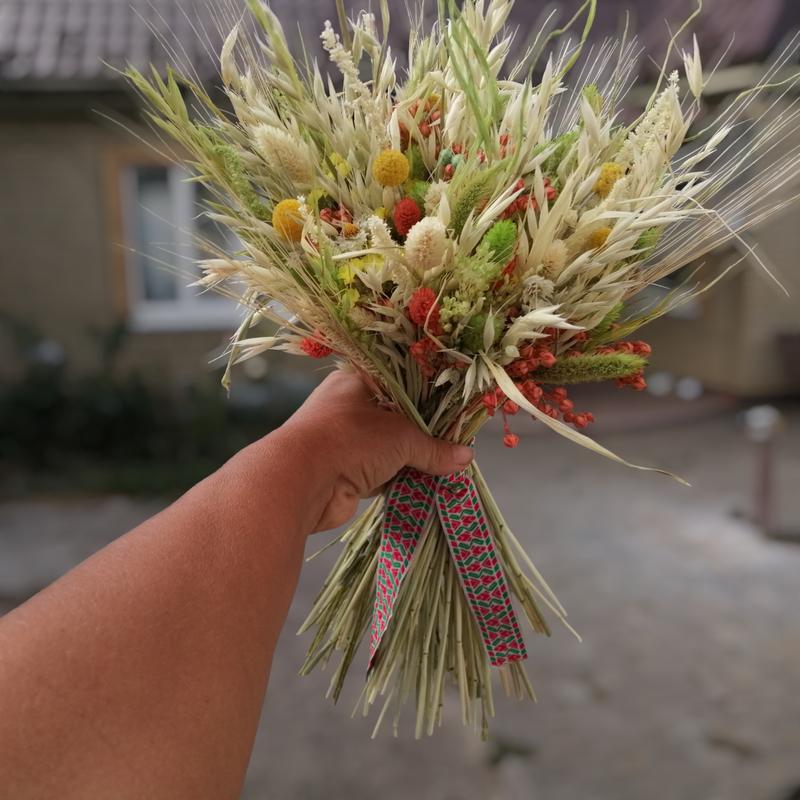 Яркий букетик из сухоцветов. В составе: ячмень, кермек, фалярис, краспедия, аммобиум, лен, просо, сетарія, дикоросы. Высота 35-40 см, диаметр 20 см. Отправка новой почтой.