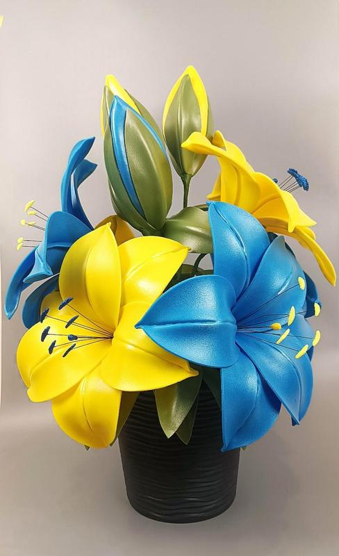 Композиция состоит: 1. цветков 6шт. 2. бутонов 4шт. 3. пластиковый горшок тёмного цвета Букет лилий из изолона - это стильная и долговечная цветочная композиция, сохраняющая красоту и свежесть на протяжении многих лет. Благодаря использованию высококачественного материала изолон цветы выглядят максимально реалистично, имеют нежные оттенки и естественную форму. Такие букеты идеально подходят для оформления мемориалов, памятников, аллей славы, кладбищ, а также для декоративного использования дома или на улице. Они не нуждаются в уходе, не выгорают на солнце и устойчивы к любым погодным условиям. ✅ Преимущества букетов из изолона: - Натуральный и реалистичный вид - Устойчивы к солнцу, влаге, морозу и ветру. - Легкие, но крепкие, не ломаются - Не теряют цвет и форму годами 📌 Где можно использовать: - Аллеи славы и мемориальные комплексы - Памятники и кладбища - Обелиски, мемориальные доски Поскольку работа авторская, повторить ее дважды до мельчайших деталей невозможно, поэтому элементы декора могут быть несущественно изменены.