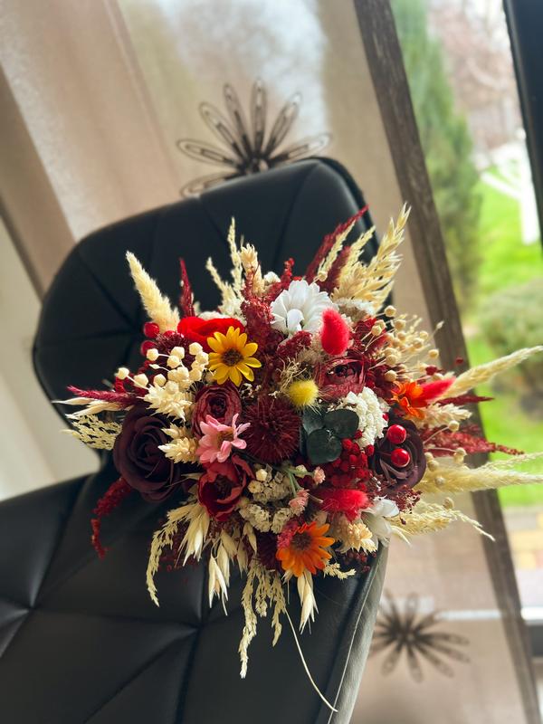 Яскравий осінній букет, створений з натуральних сухоцвітів, стабілізованих рослин і штучних квітів. Поєднання глибокого бордового, насиченого червоного, жовтого, рожевого та кремового відтінків дарує теплу атмосферу і привертає увагу з першого погляду. Кожна деталь букету зібрана вручну -- це не просто аксесуар, а витвір мистецтва. Завдяки довговічним матеріалам, букет не зів'яне з часом і залишиться чудовою пам'яткою чи елементом декору. Ідеально підходить для фотосесій, осінніх свят, подарунків, декору, етнообразів і весіль у стилі бохо чи rustic. Матеріали: сухоцвіти, стабілізовані квіти, декоративні елементи. Розмір: орієнтовно 30-35 см у діаметрі. Переваги: • 100% ручна робота • Натуральні та стабілізовані рослини • Зберігає вигляд роками • Унікальний дизайн Замовляйте зараз -- і додайте кольору та настрою вашому святу чи фотосесії!