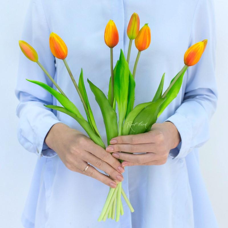 Букет латексных тюльпанов с закрытыми бутонами -- это изысканная, весенняя позиция, которая станет идеальным выбором для декора или подарка. Благодаря реалистичному внешнему виду и высокому качеству исполнения, он создаёт настоящий вау-эффект. Этот элегантный букет состоит из 7 тюльпанов высотой 40 см, где 4 бутона плотно закрыты, а 3 имеют слегка раскрытые лепестки. Каждый бутон высотой 5 см имеет нежную текстуру и выглядит настолько реалистично, что их сложно отличить от живых. Уникальное сочетание жёлто-оранжевых оттенков с градиентным переходом цветов придаёт им естественную глубину и тепло. Листья и стебли выполнены с вниманием к деталям, имеют натуральный зелёный оттенок и оснащены гибкой основой, что позволяет легко изменять форму букета, адаптируя его под любую вазу или интерьер. Каждый букет связан стильной мотузкой, которая придаёт ему завершённый вид. Цветы можно использовать как целым букетом, так и по отдельности, комбинируя их с другими декоративными элементами для создания уникальных композиций. Такой букет идеально подойдёт для весеннего декора, оформления праздничных столов, интерьера, а также для создания сложных флористических композиций.