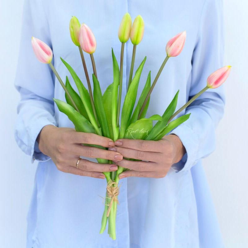 Букет латексных закрытых тюльпанов -- изысканная, весенняя позиция, которая станет идеальным выбором для декора или подарка. Благодаря реалистичному внешнему виду и высокому качеству исполнения, он создаёт настоящий вау-эффект. Этот элегантный букет состоит из 7 тюльпанов высотой 40 см, где 4 бутона плотно закрыты, а 3 имеют слегка раскрытые лепестки. Каждый бутон высотой 5 см имеет нежную текстуру и выглядит настолько реалистично, что их сложно отличить от живых. Уникальное сочетание розовых оттенков и градиентного перехода цветов придаёт им естественную глубину и очарование. Листья и стебли выполнены с вниманием к деталям, имеют натуральный зелёный оттенок и оснащены гибкой основой, что позволяет легко изменять форму букета, адаптируя его под любую вазу или интерьер. Цветы настолько реалистичны, что даже если вы поставите их в вазу с водой, эффект свежесрезанных тюльпанов гарантирован! Каждый букет связан стильной бичёвкой, которая придаёт ему завершённый вид. Цветы можно использовать как целым букетом, так и по отдельности, комбинируя их с другими декоративными элементами для создания уникальных композиций. Такой букет идеально подойдёт для весеннего декора, оформления праздничных столов, интерьера, а также для создания сложных флористических композиций.