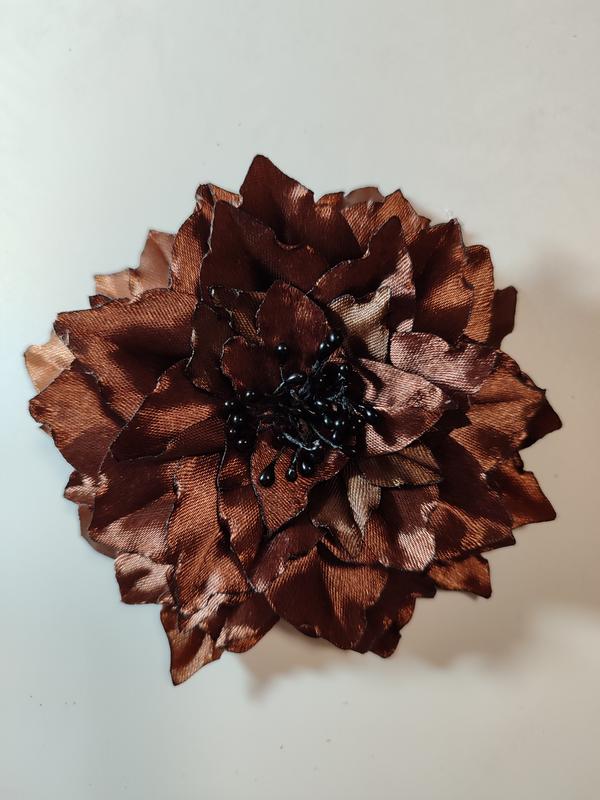 брошь коричневого цвета с черными тычинками, закрепится на застежку. Украсит любимый костюм или платье. Размером около 11 см.