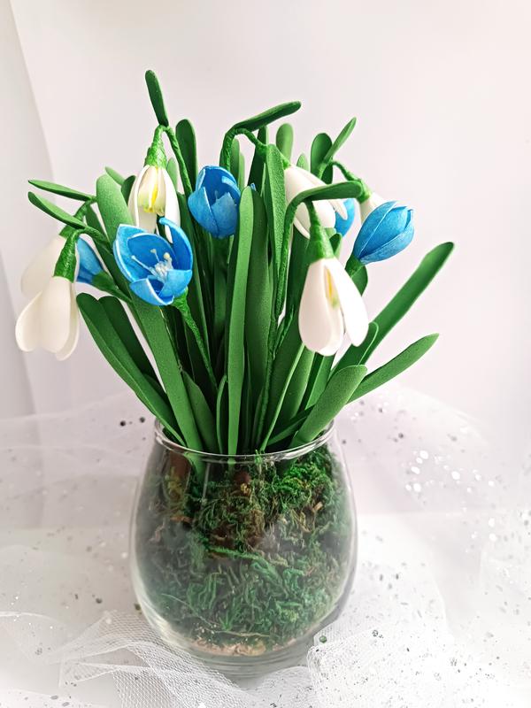 очень красивые цветы ручной работы из фоамирана, подснежники и пролески, отличное дополнение вашего интерьера и хороший подарок, ваза стекло.
