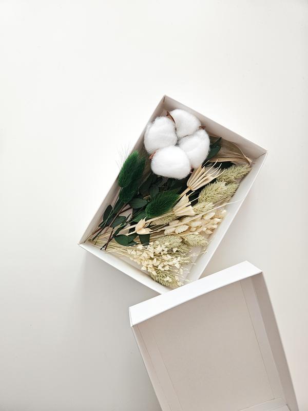 Гамма цветов: молочный, зеленый. Хлопок, бриза молочная, нигелла молочная, бриз мини молочная, паникой белоснежный, фалярис зеленый, лагурус темно зеленый, эвкалипт парвифолия зеленый, эвкалипт остролистный зеленый. Отлично подойдут для работы с эпоксидной смолой, декора свечей и прочее. Набор в размере s: Размер коробки: 15,5 x 10,5 x 3,5 см