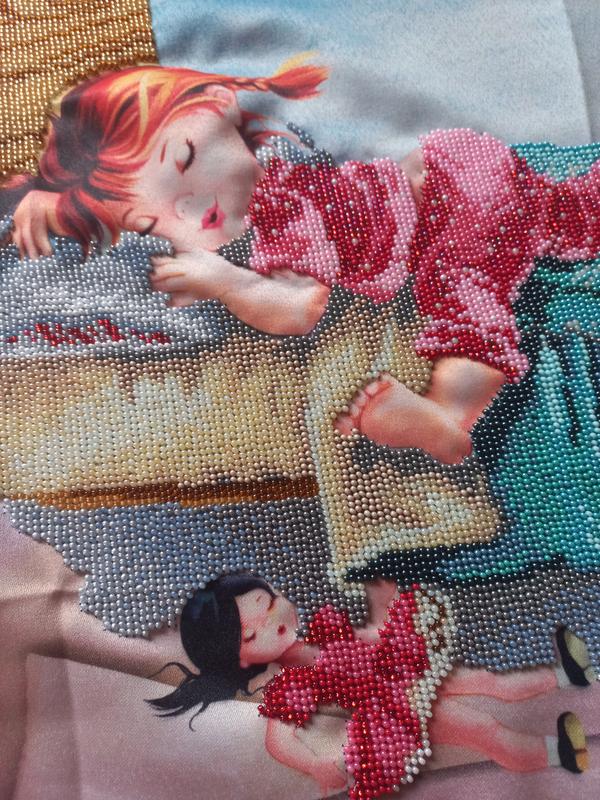 Картина вишита чешським бісером 1 сорту НЕ китайським Моя ручна робота Сама схема, без багетного оформлення (рекомендовано оформити з паспарту) Можете оформити багетом самі під інтер'єр вашої дитячої кімнати Є ще інший варіант з хлопчиком (дивіться інші мої оголошення) Підійде на подарунок чи привітання з народженням з хрещенням на довгу пам'ять РОЗМІР САМОЇ ВИШИВКИ 25.4*33.8см Вага використаного бісеру 124 гр