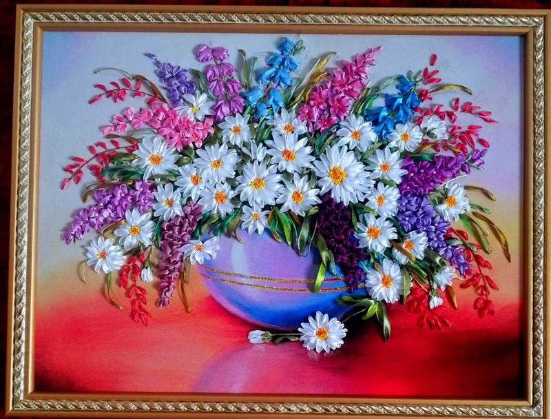 Букет квітів. Картина вышита атласними стрічками на якісному принті. Розмір 30см *40 см. Рамка дерев'яна. Чудовий подарунок