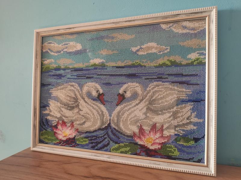 Очень яркая картина, вышитая бисером, обрамленная под стеклом. " Два лебеді " Идеально подойдет на подарок близким, друзьям или семейной паре Ширина - 40см, длина - 30см.