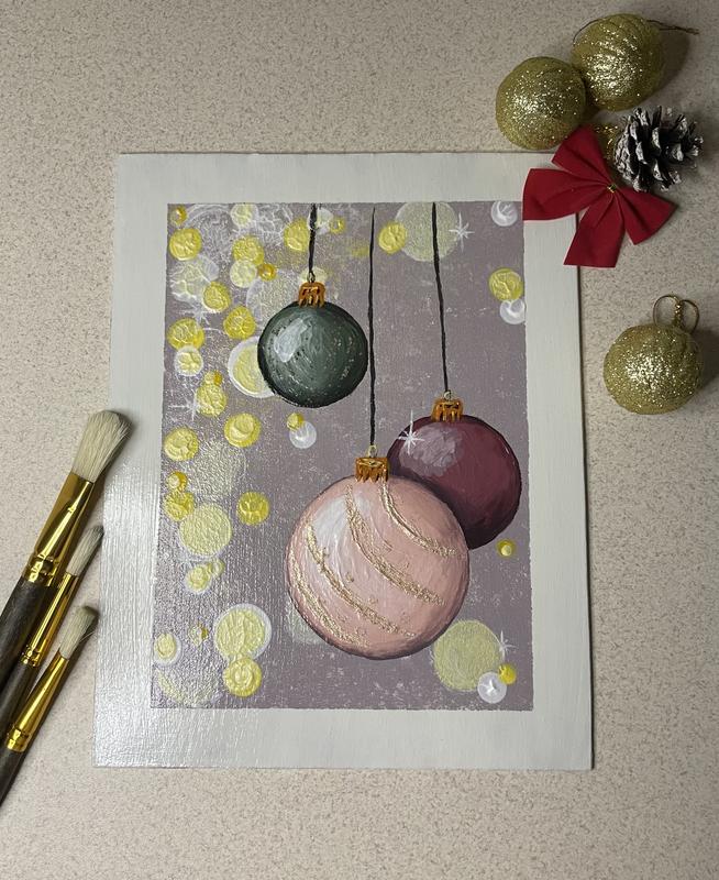 Картина акрилом на новогоднюю и рождественскую тематику - прекрасный подарок на зимние праздники. Размеры и цена: Новогодние шары 21 х 26 см, 350 грн ДСП, акрил, лак