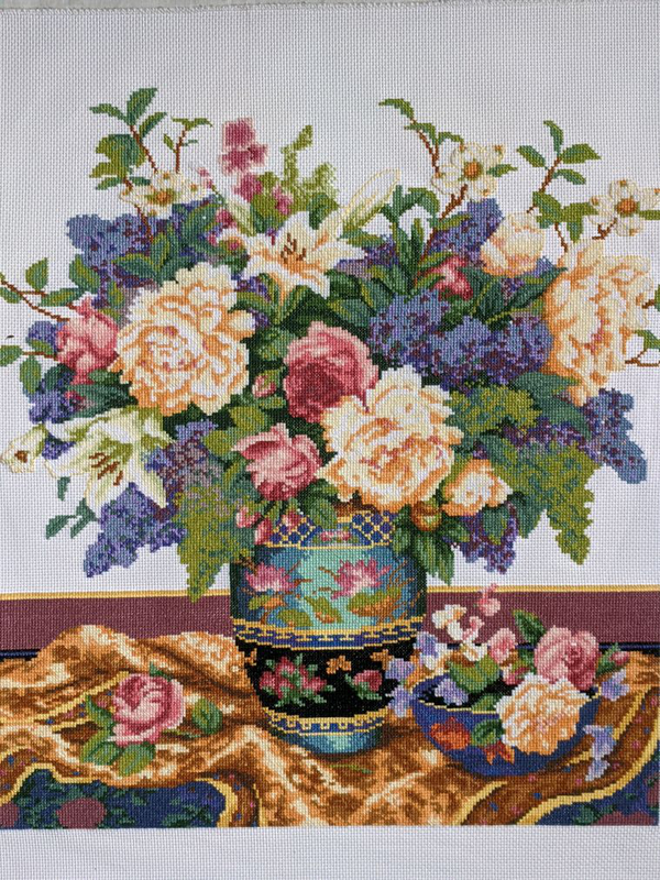 Букет на столі з хусткою, картина вишита хрестиком
