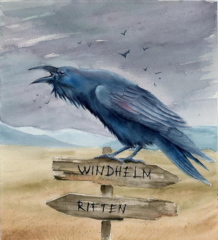 Акварель ворон на старом дорожном знаке
