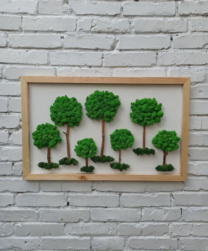 Картина 'мини-сад '. В рамке. Размеры : 50*80 см. Кроны деревьев сделаны из мха зеленого цвета. Трава - из темного. Стволы - ветки деревьев. Мох не теряет своего вида до 10 лет. Его не нужно поливать и ставить на солнце. На заказ с удовольствием сделаю другие размеры самих деревьев и соответственно и картины.