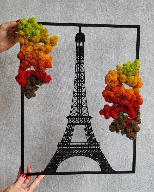 Вітаю! Пропоную дуже романтичний декор з моху на стіну, романтичну картину з Ейфелевої Вежею. осінній Париж Мрія багатьох побувати в романтичному місті - Париж може здійснитися для кожної жінки чи дівчини. Дуже суттєвий та оригінальний подарунок для дружини чи дівчини на день народження, 8 березня, день Валентина. Оригінальний подарунок дочці для будь-якого свята. Романтичний подарунок коханій жінці, дружині на річницю весілля, на 5 річницю ( дерев′яне весілля). Оригінальний подарунок молодій парі, молодій сім′ї. Основа декору вирізана з фанери 6 мм. !!!!! Прошу зауважити, що Ейфелева вежа вся теж повністю прорізана. Цей варіант картини в чорному кольорі та осінніми деревами. Переглядайте фото, бо така картина може бути в білому кольорі, або ж лишити її можна у кольорі фанери. Колір моху обрати теж можна різний.