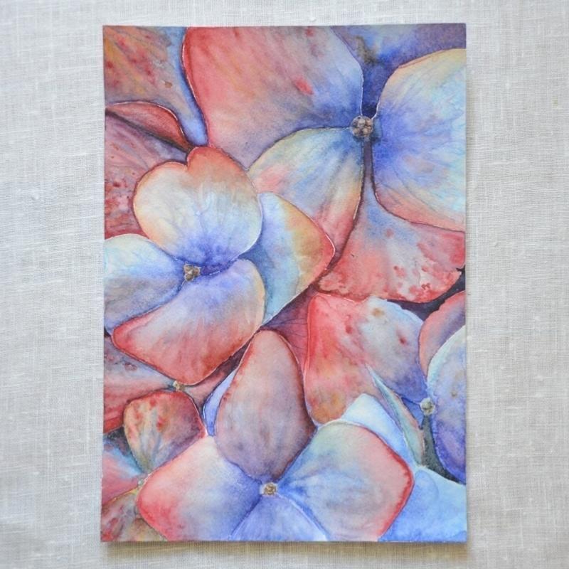 Цветки гортензии крупным планом, голубого цвета переходящим в насыщенно-красный, голубой и бежевый. Написаны акварелью, размер картины А4. Для нежного, романтичного стиля интерьера либо по Вашему вкусу. Товар под заказ