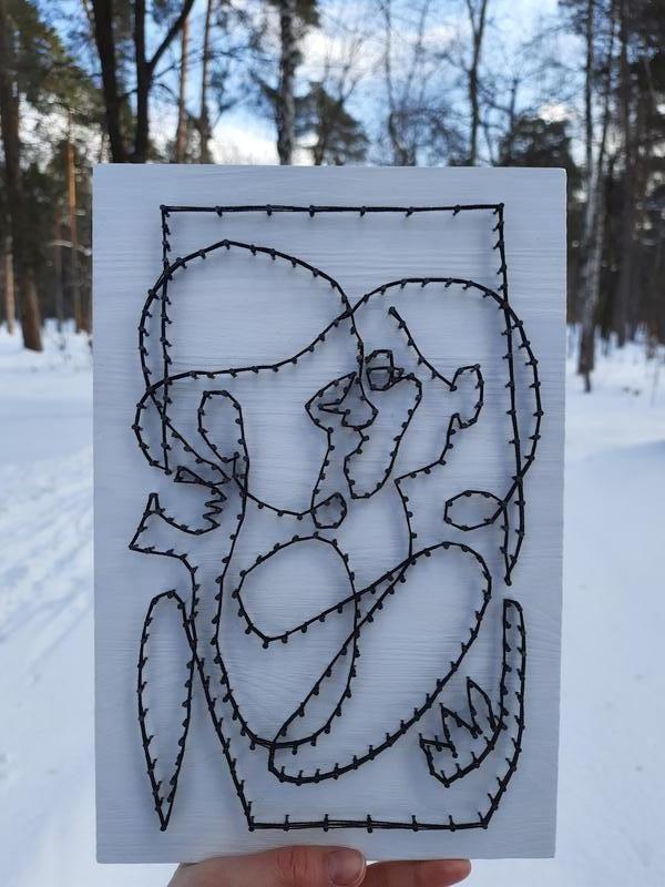 Картина в стилі стрінг-арт стане відмінним подарунком, а також елементом декору у вашому домі. Матеріали: сосновий щит (оброблений, пофарбований, покритий прозорим лаком), цвяхи і нитки. Розмір: 20*30см (А4), товщина: 1,5 див. На звороті за бажанням можна прикріпити вушко, щоб повісити картину на стіну.