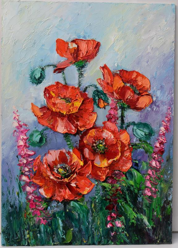 Мальовнича робота, маки, оргаліт(двп) розмір 25х35 см. На яскравий шар нанесений лак. Така картина стане чудовим доповненням інтер'єру. Матеріали: Олійні фарби. Оргаліт (двп грунтоване) розміром 25х35см. Продається без оформлення у раму. Є варіанти оформлення у раму. Зроблю додаткові фото за бажанням покупця Відправлю будь-яким перевізником по Україні Картини від початку до кінця створюються вручну мною