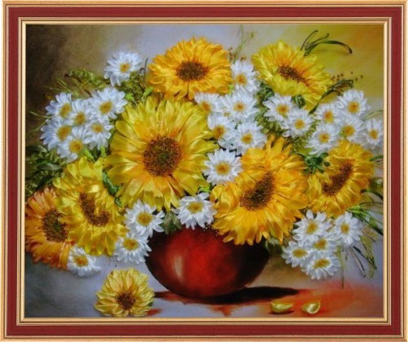 Картина выполнена атласными лентами разной ширины и оттенков на качественном принте. Подсолнухи- символ достатка, стабильности, дохода, поэтому в каждом дома должна быть такая композиция. Товар под заказ