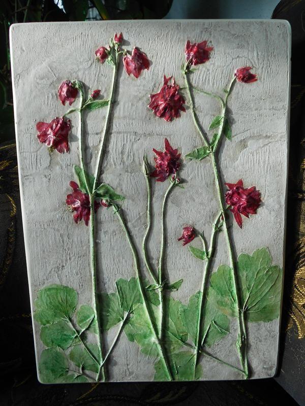 На панно оттиск аквилегии или, по-простому, водосбора. А для меня это девочки-подростки на длинных и тоненьких ножках. Они уже красивы, но еще не догадываются ни о чем и поэтому веселы и беззаботны. Панно отлиты по оттискам живых растений, внутри растений нет. Материал, из которого сделаны панно – гипс. Он пропитан специальными грунтовками, многократно покрыт акриловым лаком, расписан акриловыми красками. Панно прочные и интересные. Размер 35х25см., толщина 1,3см.