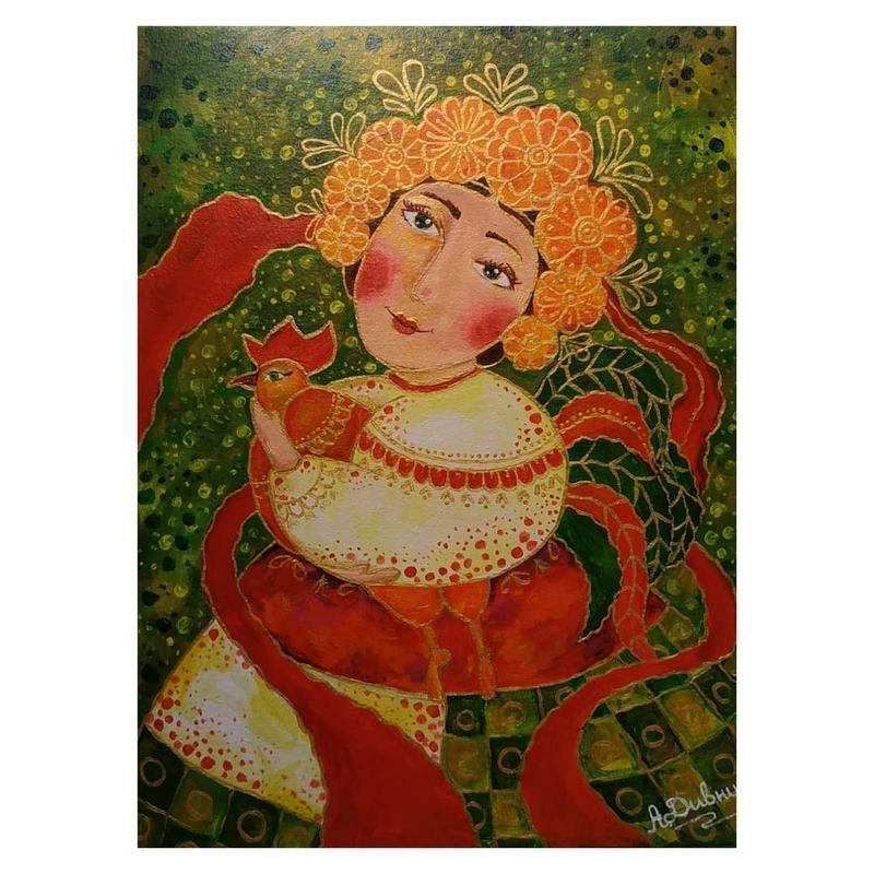 Авторская картина на холсте,акрил "Девочка с курочкой" Размер:30×40см.