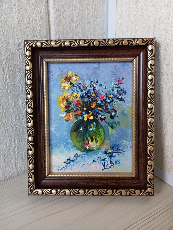 Картина написана масляными красками на оргалите мастихином пастозными мазками. размер картины 16,5 на 13,5 см. Картина покрыта лаком.