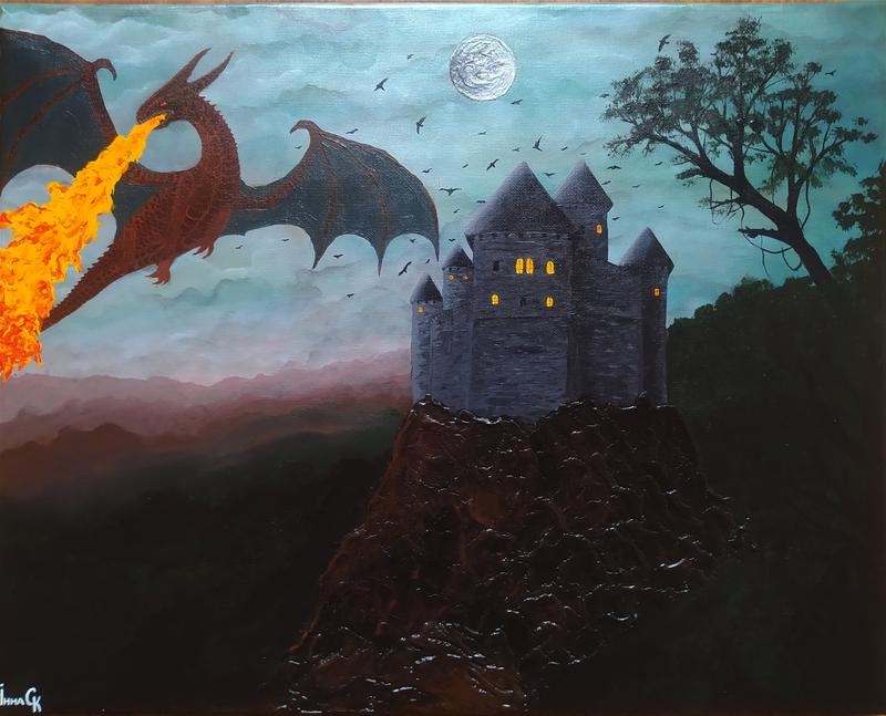 Авторская картина ручной работы, "дракон, замок, фэнтези, пейзаж"