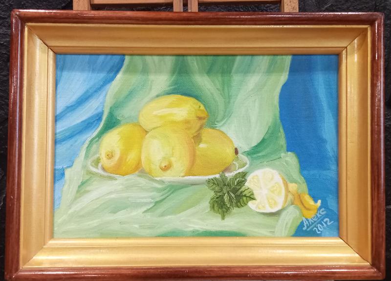 Така картина стане прикрасою для вашої кухні. Сочні лимони. Дивлячись на них, так і хочеться заварити чайку. Робота виконана олійними фарбами Холст на картоні Розмір 31х20 без рамки, 39х28 з рамкою Рамка дерев'яна Художник Корецька-Бровко Робота в єдиному екземплярі