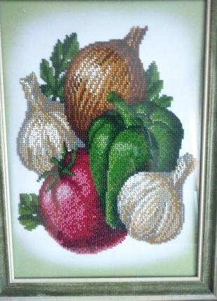 Триптих із вишитих бісером картин "Овочі".Картини оформлені в рамки, дивляться як разом, так і окремо.Розмір картини 34х25 см.