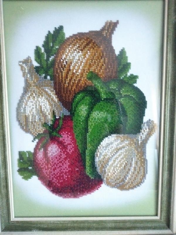 Триптих из вышитых бисером картин "Овощи".Картины оформлены в рамки,смотрятся как вместе,так и по отдельности.Размер картины 34х25 см.