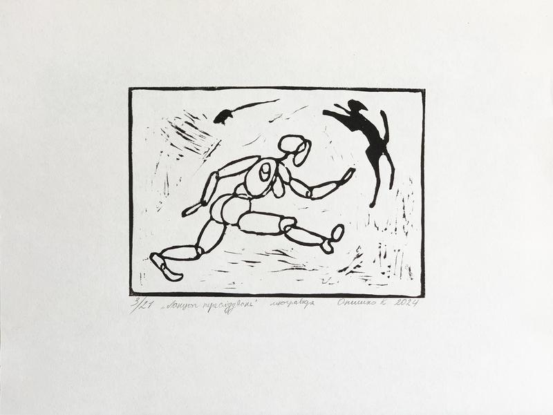 Онишко Катерина,1994 "Ланцюг переслідувань",2024 Ліногравюра 15х10,5см/ папір28х21 см, Не оформлена, в наявності декілька екземплярів! Київ Стилізована фігура в русі створює відчуття енергії та дії, а чіткий контраст із силуетом тварини додає роботі загадковості та емоційної напруги. Ця сучасна графічна робота ідеально підходить для тих, хто цінує нестандартні підходи в мистецтві, мінімалізм і глибокі смислові образи. Обмежений тираж надає кожному примірнику колекційну цінність, роблячи цю роботу чудовим подарунком для поціновувачів сучасного мистецтва. Придбайте зараз, щоб додати витончений художній штрих до вашої колекції або інтер’єру! Доставка: оплата на карту, відправка Новою/Укрпоштою