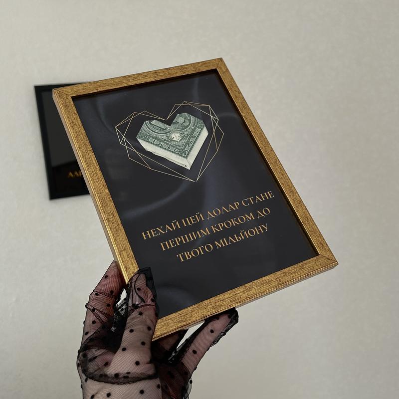 Человек, который получит рамку сможет ее использовать или как декор, мотивацию и память о вас, или вытащить деньги и что-то купить. Формат А5 (15*21см) Изготовление 2-3 дня. Стоимость за рамку с 1$ - 440 грн. Под долларовом может быть любая ваша фраза.