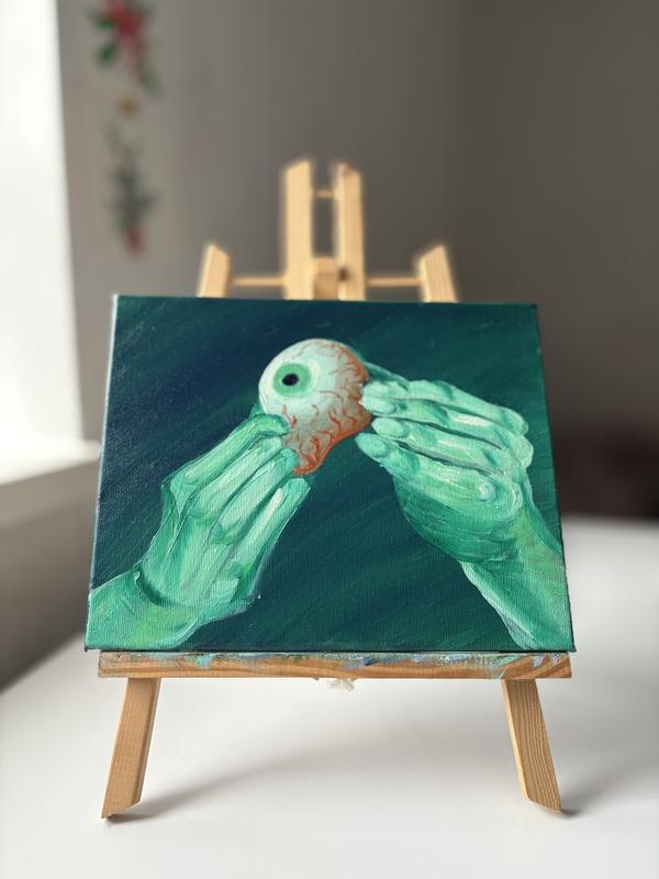 Картина на холсте с подрамником,написана масляными красками Размер 20*25 На холсте изображены две руки в зеленоватых тонах, которые осторожно держат большой глаз. Глубокий темно-зеленый фон добавляет драматичности и контраста, создавая ощущение изоляции и фокусируя внимание зрителя на центральном объекте. Глаз выглядит будто объект исследования или символ глубокого самопознания. Эта работа может вызывать ассоциации с темами контроля, человеческого восприятия и уязвимости, оставляя пространство для интерпретаций. Картина хорошо подойдет для тех, кто увлекается современным искусством с философским подтекстом.