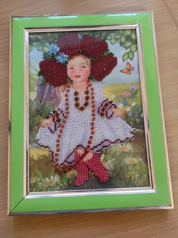 дополнит любой интерьер картина вышитая бисером девочка украинка,в рамке со стеклом, подставка также можно вешать на стену, размеры 25*19см