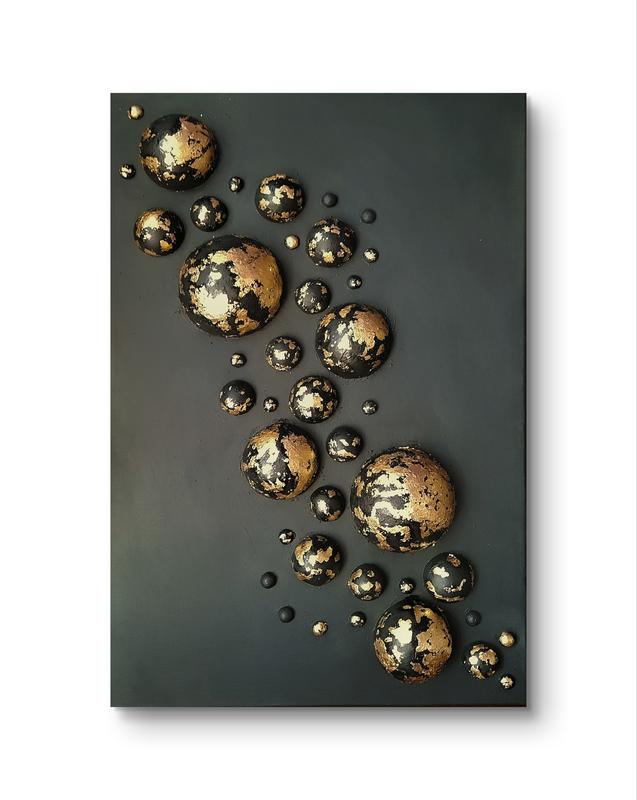 "Золотые сферы" Размер: 40x60 см Материалы: акрил, золотка Основа: холст на подрамнике (без рамы) Продаж от автора Художник Скляр Тетяна Эффектная объемная картина с золотыми сферами на глубоком темном фоне станет стильным акцентом в интерьере. Контрастная игра света и фактуры придает композиции динамичность, а золотые акценты создают ощущение роскоши. Картина идеально впишется в современные пространства, оформленные в стилях минимализм, лофт, ар-деко и модерн.