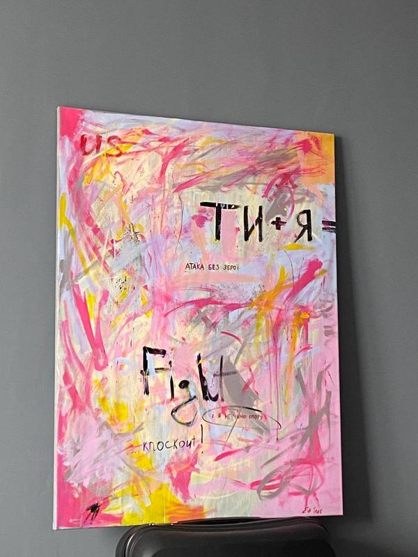 Название: Ты + Я = Knockout Формат: 100 х 75 см Материал: акрил, полотно на подрамнике Цветовая палитра: розовый, красный, желтый, голубой, серый, черный — передают энергию конфликта и слияния. Работа написана в духе современного абстрактного экспрессионизма с элементами пословной поэзии. Эта работа — эмоциональный взрыв, в котором любовь, страсть и власть переплетаются в бесоружном двубое. «Ти + Я = Knockout» — это о тех моментах, когда борьба сводится к капителяции, а сопротивление — к эротическому согласованию.