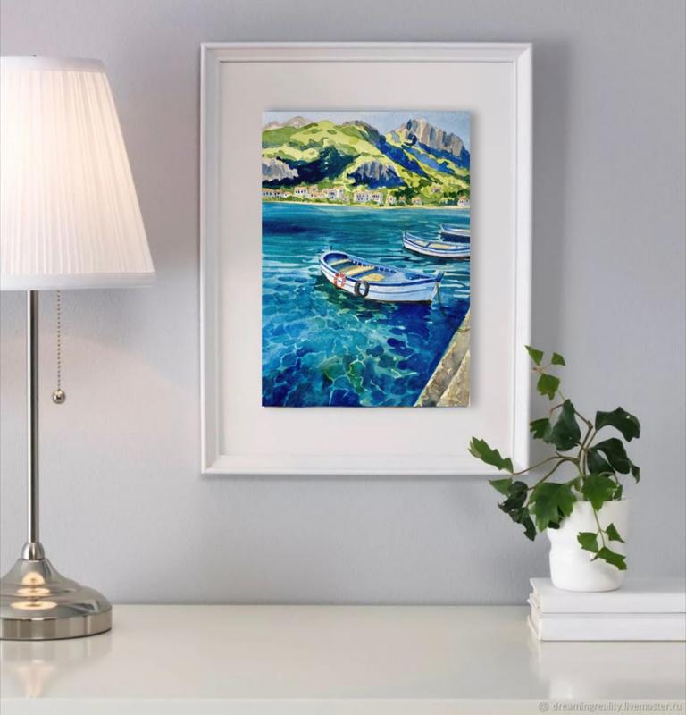 Картина написана вручную в технике акварели, что придает ей неповторимую прозрачность и легкость. Идеально подходит для украшения интерьера в морском или средиземноморском стиле