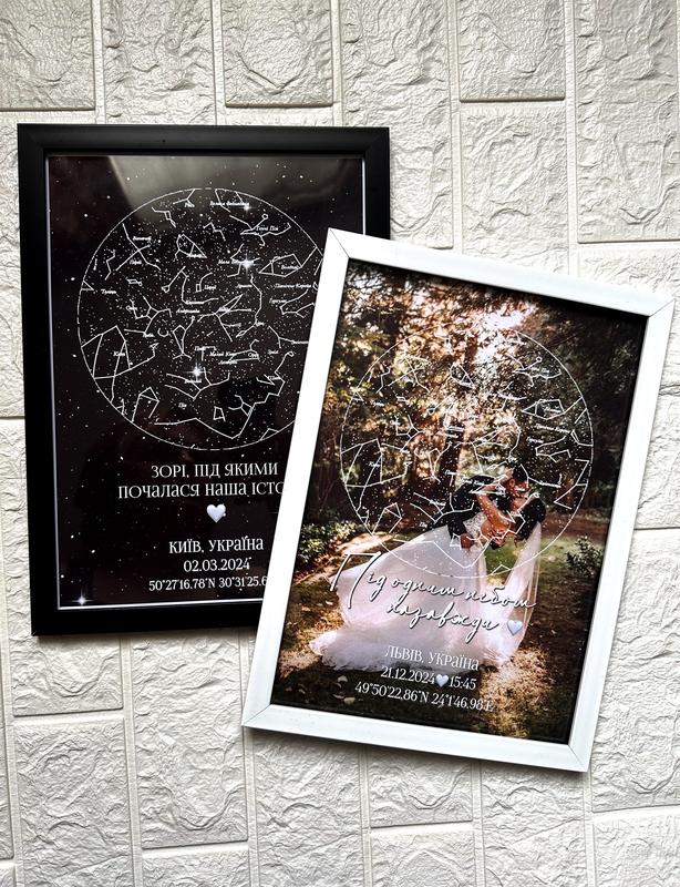 Унікальний постер із розташуванням зірок у важливий момент вашого життя: день народження, весілля, перша зустріч або поява дитини. Ідеальний подарунок зі змістом. Форма А4, срок 1-2 днів.