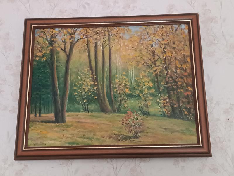 Картина "Осень" маслом. 42×32,5(непосредственно рисунок), с рамкой -размеры на фото. --- 🖼️ Осенняя симфония в лесу - авторская картина в раме Погрузитесь в спокойный осенний лес, где золотистые листья мягко опадает на зеленую поляну, а свет пробивается сквозь высокие деревья, создавая атмосферу уюта и гармонии. Эта картина передает очарование природы в период ее самых теплых красок — осени. 🔸 Характеристики: - Сюжет: Лесная сцена с высокими деревьями, желтым и зелеными листьями, кустом на переднем плане - Техника: Масляная живопись, ручная работа - Размеры: приблизительно 49 × 42 см (включая раму) - Рама: Деревянная, коричневая с внутренней золотой отделкой, добавляет элегантности и завершенности - Состояние: отличный, без повреждений 🔹 Идеально для: - Декору гостиной, кабинета или уютного уголка для чтения - Подарок для ценителей природы и искусства - Коллекционеров авторских пейзажей --