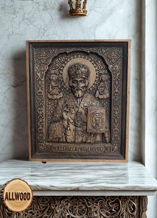 Резьблёная деревянная икона Святого Никола Чудотворца в деревянной рамке. Высококачественное натуральное дерево (например, дуб или другая твердая порода), которое обработано и покрыто защитными средствами, которые подчеркивают глубокий оттенок и текстуру древесины.