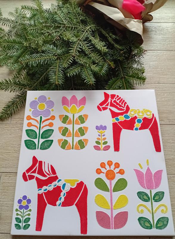 В наличии авторская объемная картина с цветами и лошадьми Далахаст. Идеальный вариант для себя или на подарок. Кони Далахаст (или Даларнские лошади, Dalahäst) - это знаменитые традиционные шведские деревянные росписные фигурки лошадей из провинции Даларна, которые стали национальным символом Швеции. Их часто отображают без хвоста. Лошадь Далахаст является символом шведской культуры и народного искусства, также они известны во всем мире. Картина выполнена в виде трафаретного нанесения рисунка структурной пастой и раскрашена акрилом. Основа холст. Размер 40 на 40 см. Отправка н.п. укр.почта только после оплаты. Самовизвоза, накладного и возврата нет.