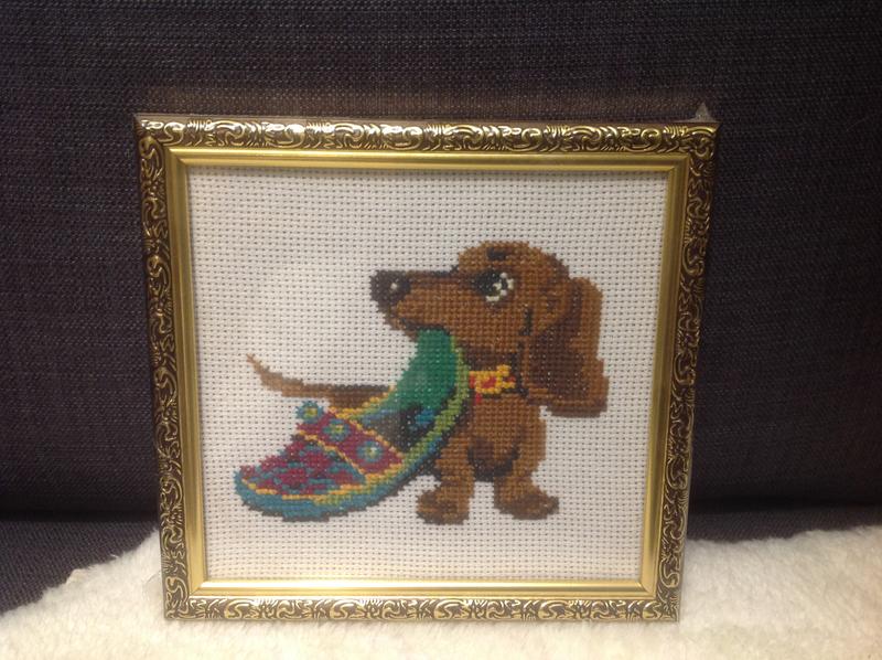 Картина вышита крестиком в рамке. Размер 16 * 15 см. Эта картина в прихожей будет вызывать улыбку у хозяев и гостей:)