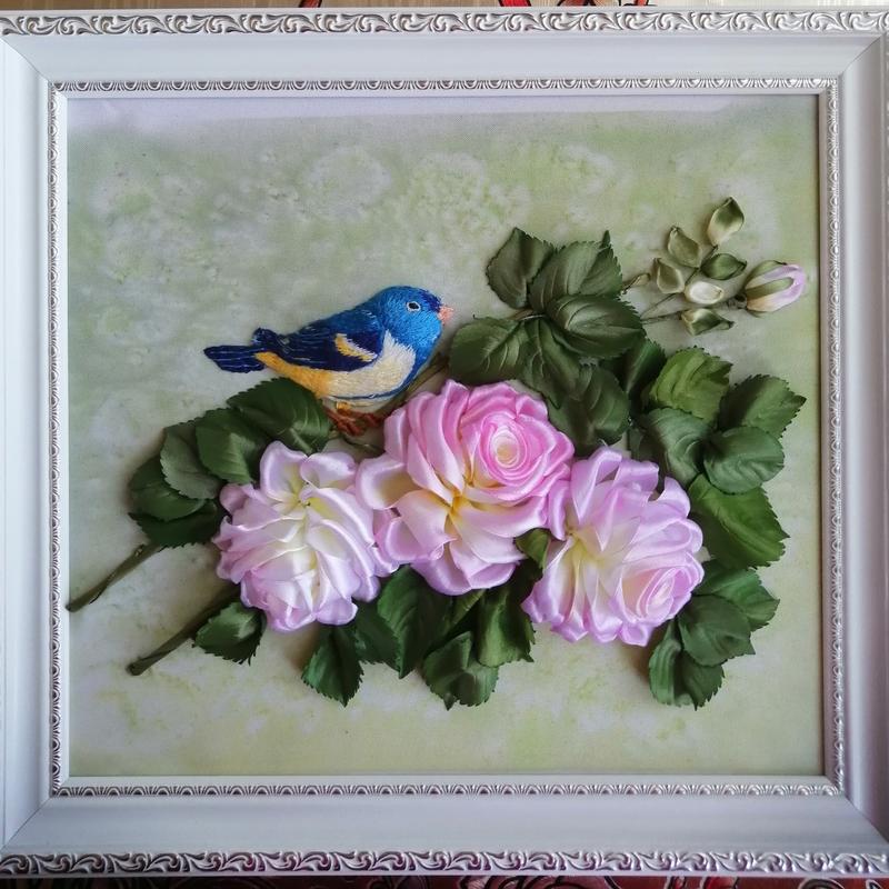 Картина вышита атласными лентами. Птица выполнена художественной гладью в технике трапунто. Очень реалистичная работа. Работа авторская, не на принте. Фон окрашен красками для батика. Основа-габардин. Ленты окрашены вручную красками для батика. Оформлена в рамку без стекла. Это эксклюзивный подарок для тех, кто любит уют и необычные милые штучки.