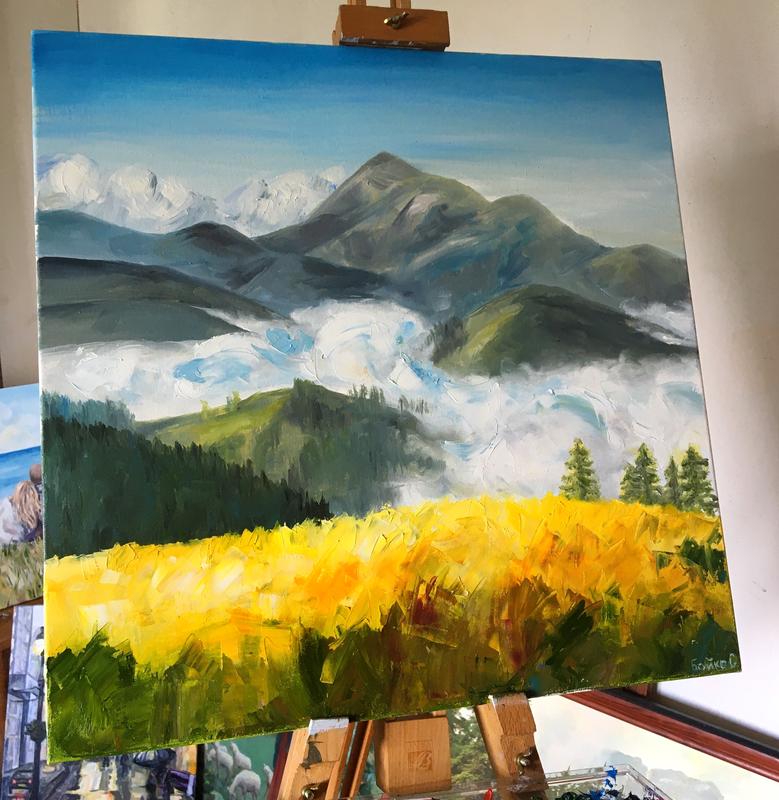 Картина «Карпатські гори» написана професійними олійними фарбами на полотні та підрамнику. Авторська робота у одному екземплярі. Розмір 50*50 см.
