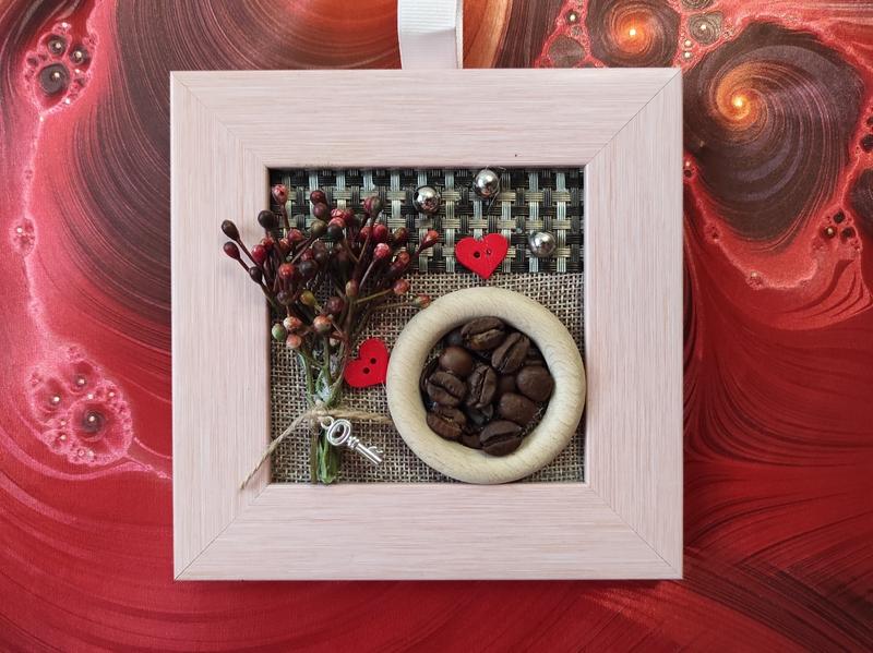 Мини картина. Изящный декор на стену или на полку. Гармонично дополнит комфортом и уютом Ваш дом 🏡 И станет оригинальным и запоминающимся подарком💕 Материалы:дерево, лен, кофе, бисер. Размеры:15х15 Дополнительно упаковывается в оригинальную коробочку.