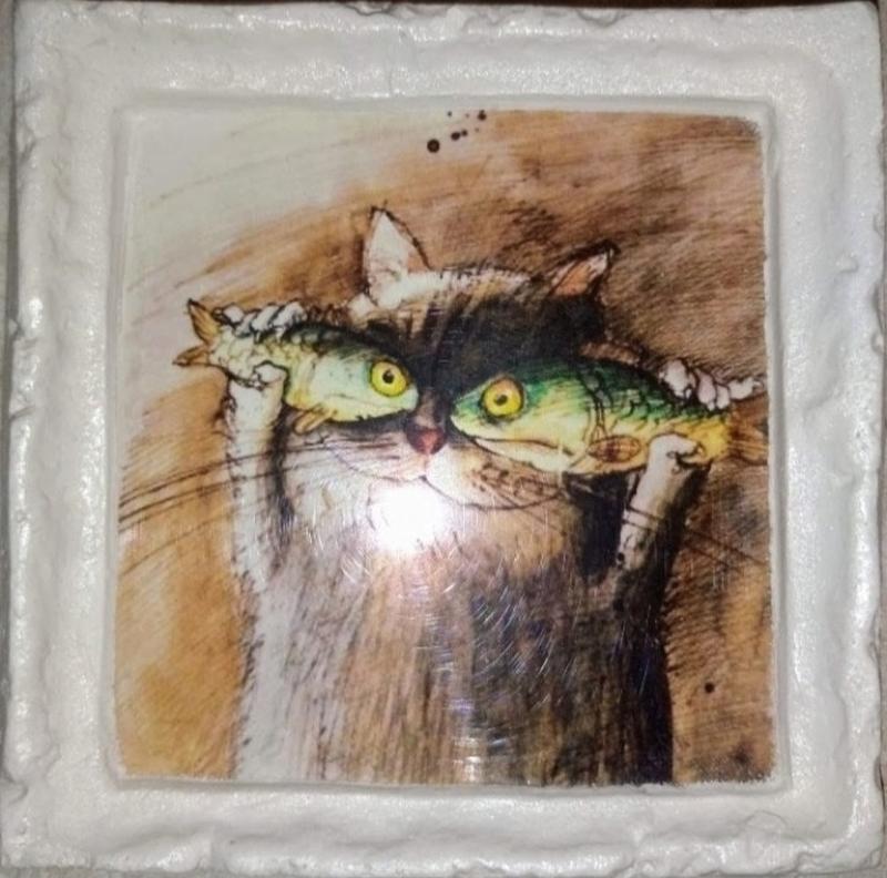 холодная керамика, 12*9 см, рисунок нанесен на тыльную сторону мягкого стекла зеркально и стационарно залит в рамку