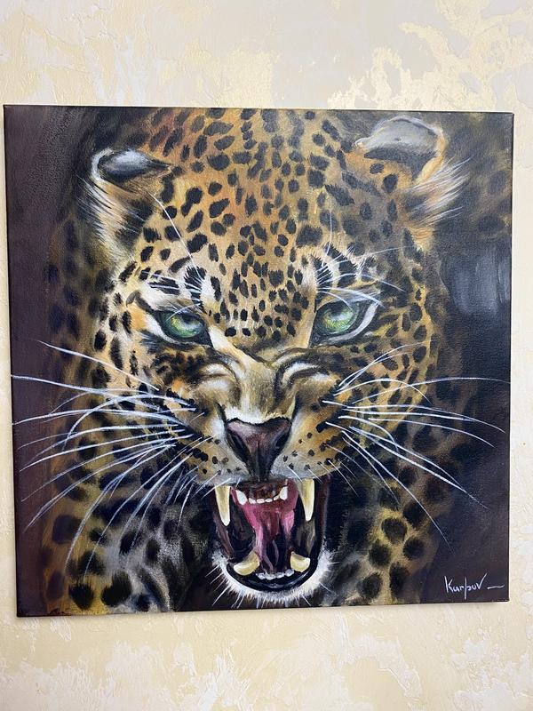 Картина выполнена акриловыми красками. Холст на подрамнике. Размер 40*40 Леопард – воплощение прыти и неустрашимости. Символизирует ярость, безжалостную силу, храбрость, гордость, скорость.