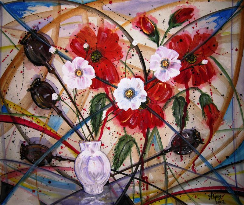 Техника смешанная .Акрил , акварель ,гуашь . Неодназначно о маках . Добро и зло