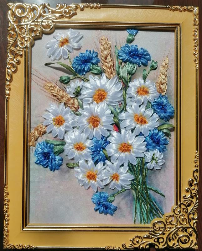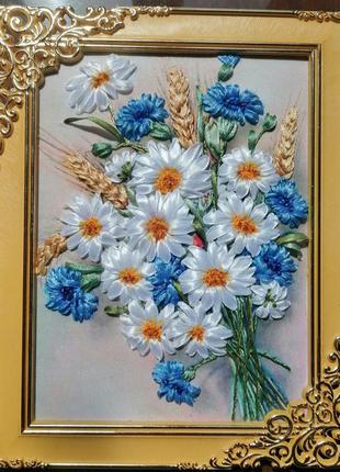 Літній букет. Картина, вишита атласними стрічками. Розмір 15 *20 див. пластикова Рамка